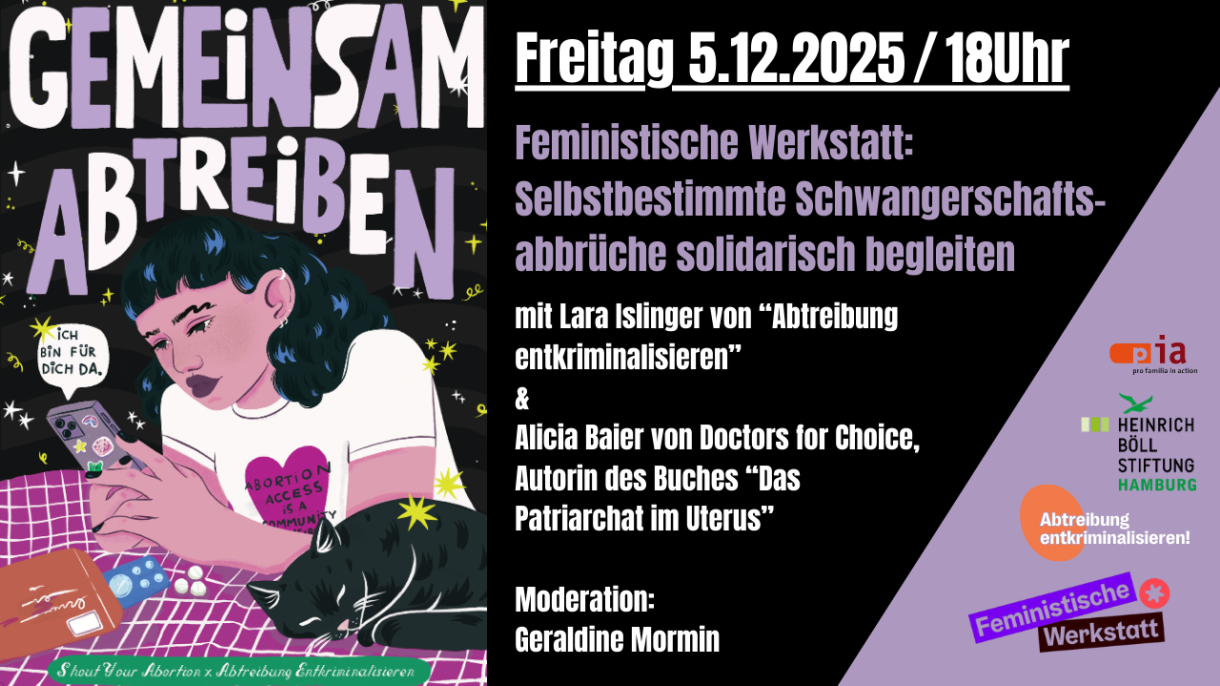 Die Veranstaltung ist eine Kooperation der Heinrich Böll Stiftung Hamburg mit pia pro familia Hamburg und Abtreibung entkriminalisieren. Die Feministische Werkstatt ist ein reisendes Format des Stiftungsverbunds der Heinrich-Böll-Stiftungen und des Gunda-Werner-Instituts.